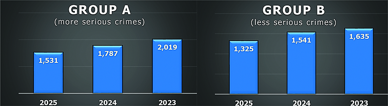 Crimes in both serious crime and less-serious crime categories dropped 14% from 2024, according to the data. Major crime numbers that fell last year included robberies (down 59%), motor vehicle theft (down 58%), burglary (down 24%), assaults (down 19%) and larceny/thefts (down 15%).