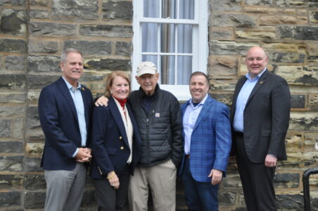 From left, Wheeling Park Commission President and CEO Bob Peckenpaugh, U.S. Sen. Shelley Moore Capito, former Oglebay Park President Randy Worls, park donor Rocky Fitzsimmons and Oglebay Foundation President and CEO Eriks Janelsins pose for a photo after touring the Crispin Center at Oglebay Park. Capito helped secure $5,642,000 to renovate the exterior of the historic structure. (Photo by Stephanie Elverd)