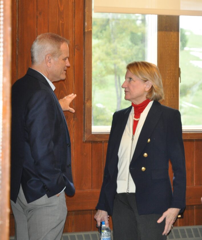 U.S. Sen. Shelley Moore Capito tours the Crispin Center at Oglebay Park with Randy Worls, who served as president and CEO of the park for four decades, on Tuesday. Worls, who established the Oglebay Foundation before retiring, began working at the park at age 16. Capito helped secure $5,642,000 in funding to renovate the post-depression-era structure. (Photo by Stephanie Elverd)