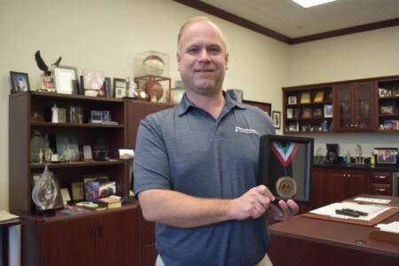 Bob Contraguerro Jr. of Panhandle Cleaning & Restoration has been named as the 2026 Italian American of the Year by the Undo's Upper Ohio Valley Italian Heritage Festival executive committee, who gathered to congratulate him Wednesday. Contraguerro is shown holding the medallion presented to his father, Bob Contraguerro Sr., in 2012 when he was named Italian American of the Year. (Photo by Eric Ayres)