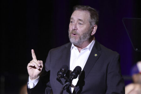 FILE - Ohio Attorney General Dave Yost speaks during a campaign rally for Republican vice presidential candidate Sen. JD Vance, R-Ohio, in Middletown, Ohio, July 22, 2024. (AP Photo/Paul Vernon, File)
