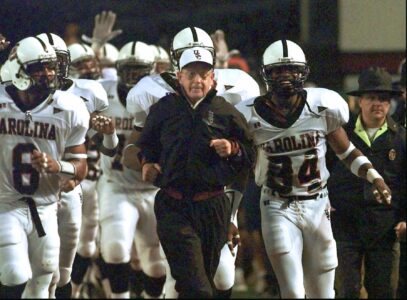 Lou Holtz, center, is shown leading his South Carolina team onto the field Saturday, Sept. 4, 1999, in Raleigh, N.C., in their season-opener against North Carolina State. Holtz made the South Carolina Top 10 sports stories of the year in negotiating a year of difficulty, both professional and personal. In his first season at South Carolina, the team failed to win a game, the worst season in school football history. (AP Photo/Grant Halverson)