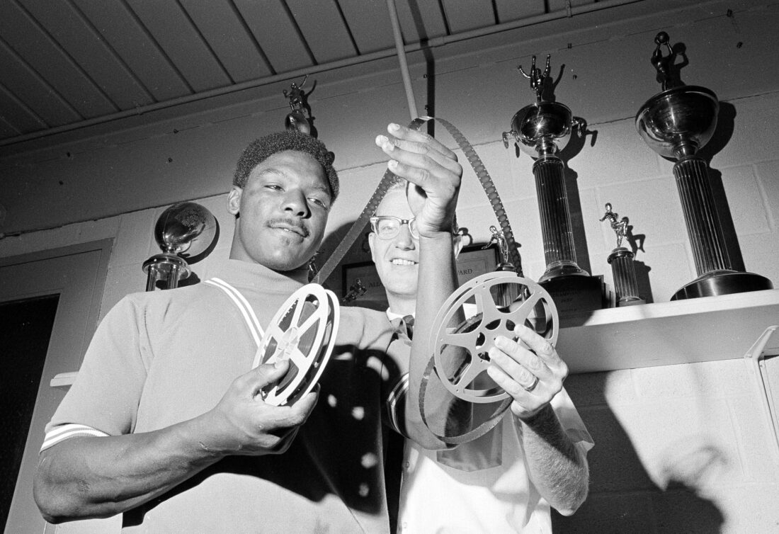 Ohio State football defensive back John Tatum, left, views last Saturday's Ohio-Purdue game films with defensive backfield coach Lou Holtz after Tatum was named Back of the Week in an Associated Press poll, Oct. 16, 1968. Tatum is a sophomore from Passaic, N.J. "It was the greatest defensive effort i've ever seen," head coach Woody Hayes said after his Buckeyes stopped Purdue, 13-0. (AP Photo/Gene Herrick)