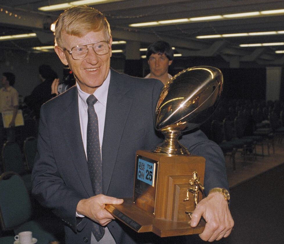 Notre Dame head coach Lou Holtz carries off the National College Champion trophy that was presented to Notre Dame during a press conference in Tempe, Arizona, Jan. 3, 1989. Lou Holtz and his fighting Irish defeated West Virginia 34-21 in the Fiesta Bowl. (AP Photo/Rob Schumacher)