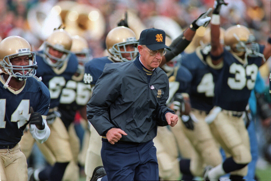 - FILE – In this Nov. 13, 1993, file photo, Notre Dame coach Lou Holtz runs onto the field with his team before the start of their game against Florida State in South Bend, Ind. Two decades later, it’s still open to debate whether college football ever had a better afternoon than on Nov. 13, 1993, when No. 1 Florida State visited No. 2 Notre Dame. (AP Photo/Joe Raymond, File)
