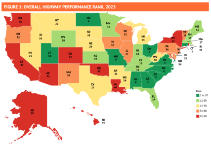 “While the state performs strongly in Capital and Bridge Disbursements (fourth), Administrative Disbursements (seventh), and Urbanized Area Congestion (fifth), its poor rankings in bridge condition and roadway fatalities remain areas for improvement,” Feigenbaum continued.
