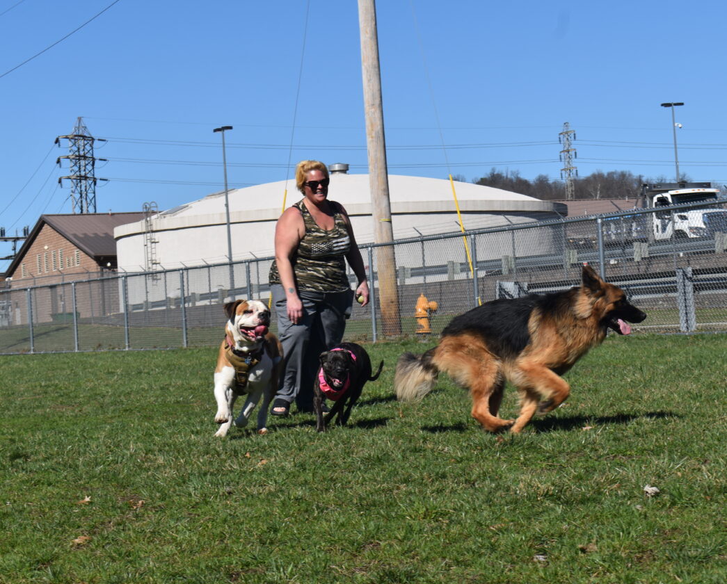 Deidre Elias of Wheeling enjoys the sunshine Monday at the Fitzsimmons Family Dog Park in Warwood with four-legged friends Brutus, her dog Ella, and Arlo. Because of unseasonably warm weather in recent weeks, the city of Wheeling opened one of the city’s two dog parks early this season. (Photo by Eric Ayres)
