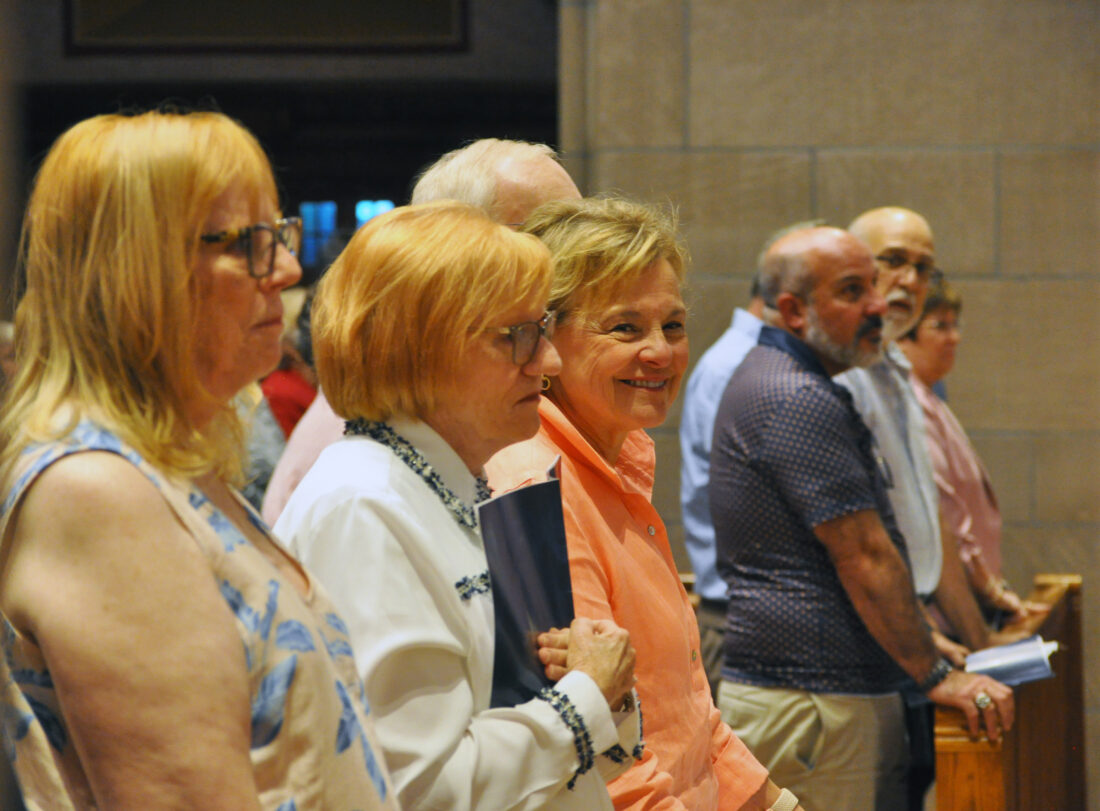 Photo by Stephanie Elverd Descendants of architect Edward J. Weber sit in the front pews Tuesday during the Centennial Mass at the Cathedral of St. Joseph in Wheeling, marking the church’s 100th anniversary of consecration.