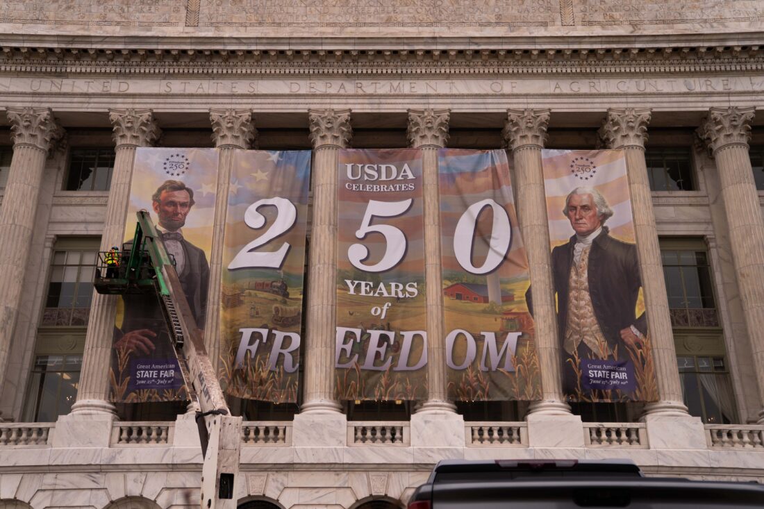 Crews fix the banners in front of the Department of Agriculture on Friday, March 20, 2026, in Washington. (AP Photo/Allison Robbert)