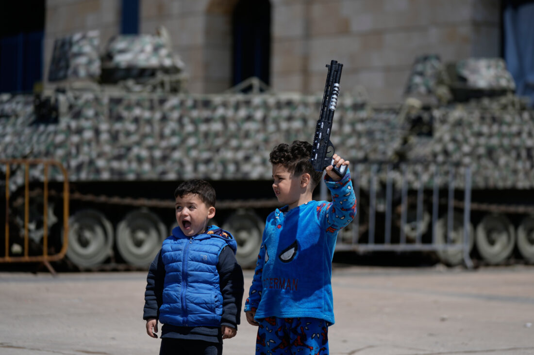 - A displaced boy holds up a toy gun at Camille Chamoun Sports City Stadium, which has been turned into a shelter for people fleeing Israeli airstrikes in southern Lebanon, in Beirut, Lebanon, Wednesday. (AP Photo/Bilal Hussein)