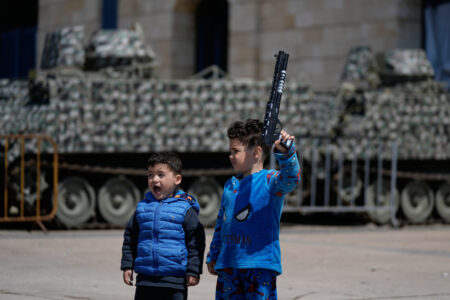A displaced boy holds up a toy gun at Camille Chamoun Sports City Stadium, which has been turned into a shelter for people fleeing Israeli airstrikes in southern Lebanon, in Beirut, Lebanon, Wednesday. (AP Photo/Bilal Hussein)