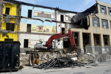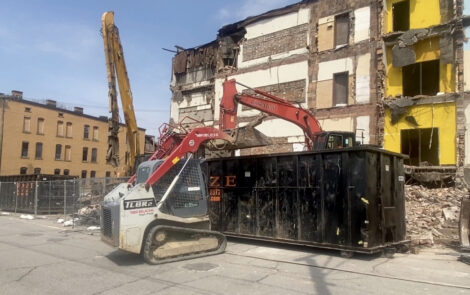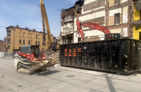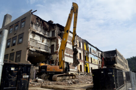 Photo by Derek Redd Crews from Raze International continue the demolition of the old Clay School in East Wheeling.