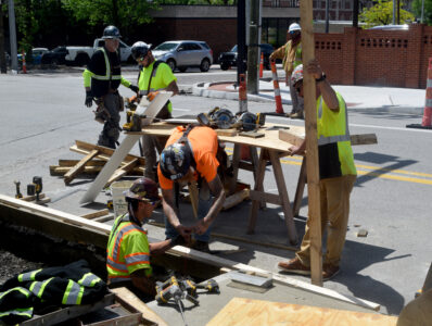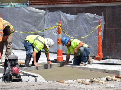 - Photo by Derek Redd Workers with Triton Construction smooth out new cement for sidewalks near the corner of 16th and Eoff streets in Wheeling on Tuesday.