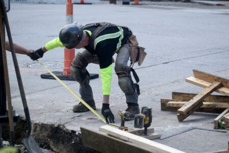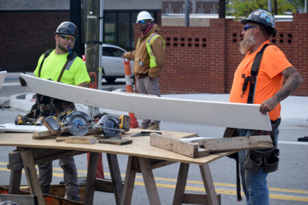 - Photo by Derek Redd Crews with Triton Construction work on replacing the sidewalks at the corner of 16th and Eoff Streets on Tuesday afternoon.