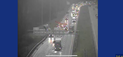 Traffic snarled on I-70 east near The Highlands due to tractor-trailer accident