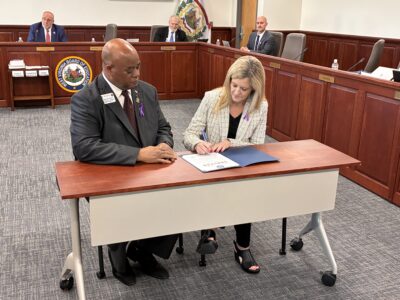 State Superintendent of Schools Michele Blatt and retired lieutenant colonel Johnny Ross, the West Virginia Army Reserve Ambassador and director of outreach for the West Virginia Employer Support of the Guard and Reserve, signed a joint statement of support in honor of Purple Up Month.
