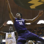 Kansas State forward Dean Wade (32) drives the basket while being defended by West Virginia forward Esa Ahmad (23) during the first half of an NCAA college basketball game, Saturday, Feb. 11, 2017, in Morgantown, W.Va. (AP Photo/Raymond Thompson)