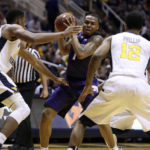 - West Virginia guard Tarik Phillip (12) drives to the basket while being defended by Kansas State forward Dean Wade (32) and forward Wesley Iwundu (25) during the second half of an NCAA college basketball game, Saturday, Feb. 11, 2017, in Morgantown, W.Va. West Virginia defeated Kansas State 85-66. (AP Photo/Raymond Thompson)