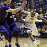 - West Virginia guard Teyvon Myers (0) drives to the basket past Kansas State forward Wesley Iwundu (25) during the second half of an NCAA college basketball game, Saturday, Feb. 11, 2017, in Morgantown, W.Va. West Virginia won 85-66. (AP Photo/Raymond Thompson)