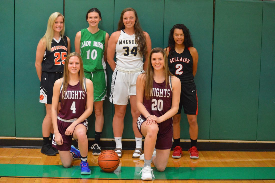 - Photos by Cody Tomer There were a lot of points scored amongst the group of girls selected for the All-Valley Big School team. Front row are captain Shay Straughn (John Marshall), left, and Shanley Woods (Wheeling Park). Back row, from left, are Emily Holzopfel (Buckeye Local), Hope Bowman (Brooke) and Sydney Starr (Harrison Central). Not pictured are Makayla Abram (Steubenville), Kylie Kiger (Indian Creek) and Jenna Riccardo (Beaver Local). This year’s Small School All-Valley Girls’ Basketball team has a great mix of double-double machines to 3-point threats. Front row are the Wheeling Central duo of Eden Gainer, left, and Kaylee Reinbeau. Back row, from left, are Baylee Wach (Shadyside), Kaylin Nixon (Bellaire St. John), Kyndra Pilant (Magnolia) and Katrina Davis (Bellaire). Not pictured are Mady Winters (Magnolia) and captain Lauren Flannery (River).