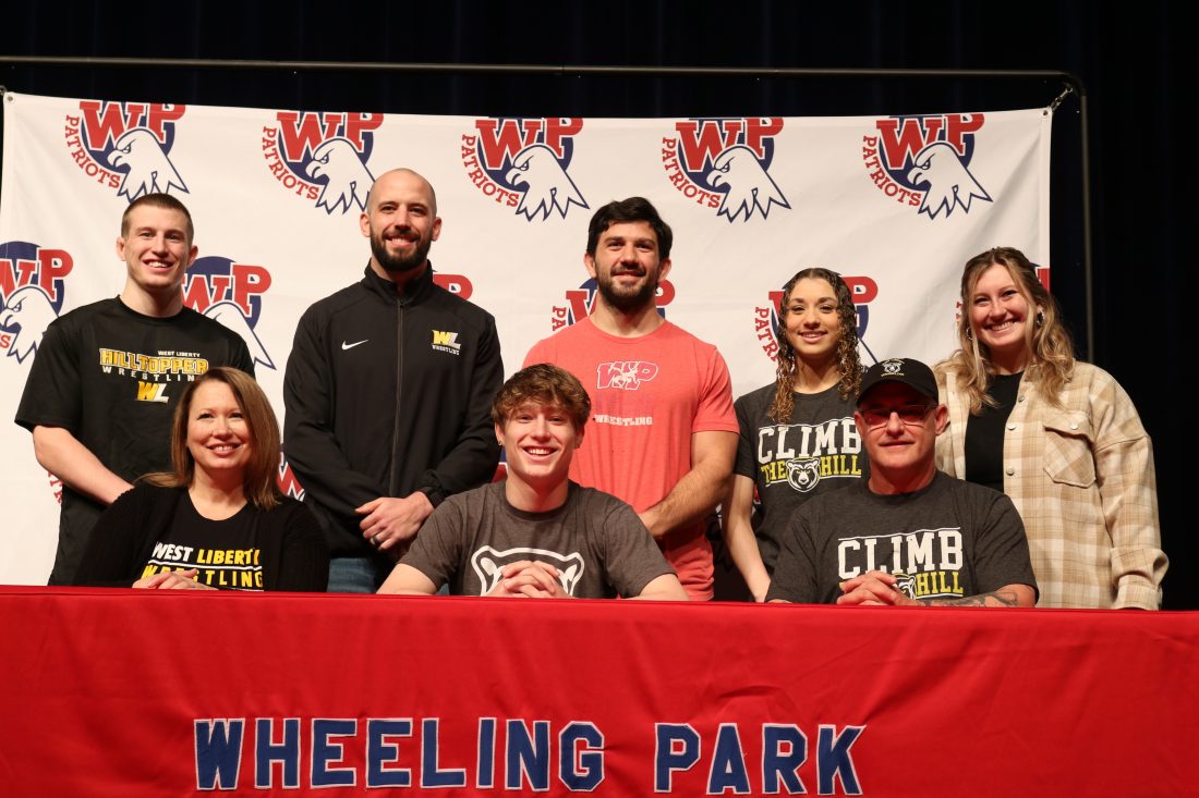 Wheeling Park’s Nate Shelek signs with West Liberty Wrestling while joined by his mother Anita Shelek, left, and father Todd Shelek, right. Standing, left to right, are brother Andrew Shelek, Park wrestling coach Brian Leggett, assistant coach Dan Doyle and sister Kailee Shelek.