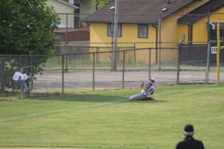 - Photo by Cody Nespor Moundsville Post 3 left fielder Chad Frazier makes a sliding catch during a game against the Wheeling Wildthings Friday.