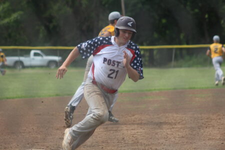 - Photo by Cody Nespor Moundsville Post 3’s Cole Sutphin races home to score a run against the OV Mountaineers Friday.