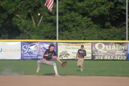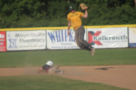 - Photo by Cody Nespor Wellsburg shortstop Andrew Coursin leaps to stop a ball from going into the outfield as Moundsville’s Tyler Stauffer slides into second base during a game Monday evening.