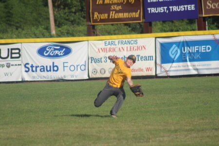 - Photo by Cody Nespor Wellsburg right fielder Austin Robinson lunges to make a catch against Moundsville Post 3 during a game Monday.
