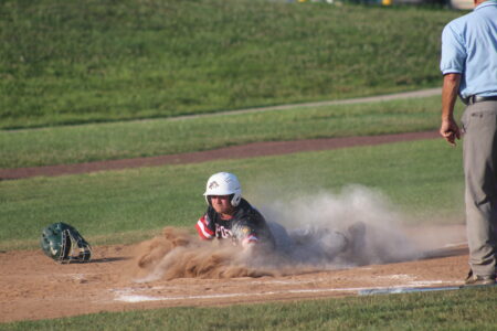 - Photo by Cody Nespor Moundsville’s Tyler Stauffer slides safely into home plate during a game against Wellsburg Post 34 Monday evening.