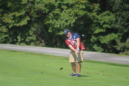 - Photo by Cody Nespor Wheeling Park’s Gavin Goodrich chips onto the green on 18 during the OVAC 5A Golf Championship Thursday.