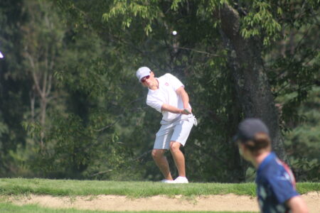 - Photo by Cody Nespor Dover’s Zach Dale chips over a sand trap on 18 during the OVAC 5A Golf Championship Thursday.