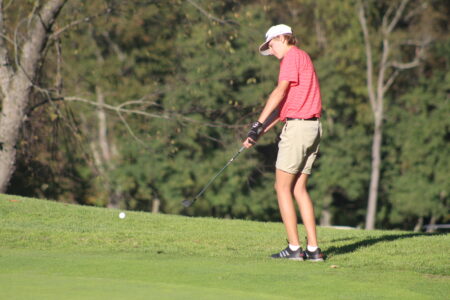 - Photo by Cody Nespor Wheeling Park’s Noah Milhoan chips onto the green on 9.