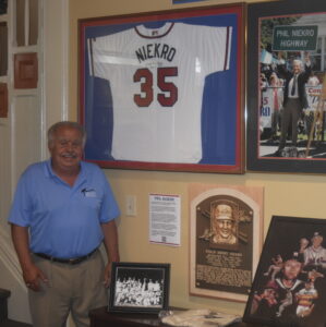 Bridgeport businessman Gordie Longshaw is pictured in front of a display of memorabilia from Blaine natives Phil and Joe Niekro that is part of the “Ohio Valley Athletic Legends” exhibit at the Belmont County Heritage Museum in St. Clairsville. The Niekro’s still hold the Major League Baseball for combined pitching wins by brothers with 539.