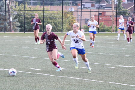 Wheeling Central Catholic’s Ramsay Mansuetto chases after a ball during a regular season outing. Mansuetto was selected to the Class A/AA second team.