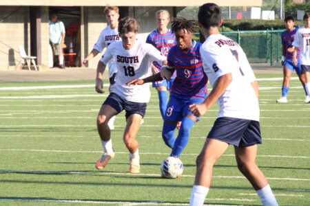 Wheeling Park’s Tresz McLeod keeps control of the ball with a Parkersburg South defender on his hip during a regular season match earlier this year. McLeod was named to the Class AAA first team along with teammate Luke Dunaway.