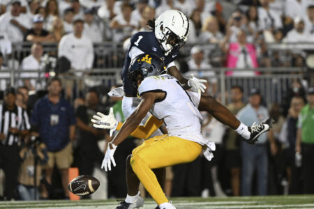 West Virginia cornerback Beanie Bishop Jr., bottom, breaks up a pass intended for Penn State wide receiver KeAndre Lambert-Smith (1) during the first half of an NCAA college football game against Penn State, Saturday, Sept. 2, 2023, in State College, Pa. (AP Photo/Barry Reeger)