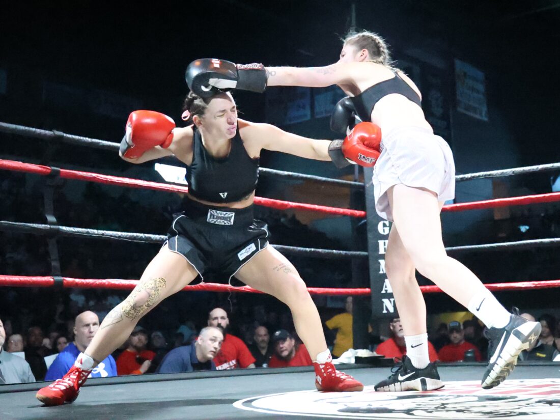 Wheeling’s Lersten McAbee, left, jabs to the stomach of Mary Kaffana, of Mingo Junction, in their women’s lightweight bout during the opening night of the 43rd annual Ohio Valley Toughman Contest inside WesBanco Arena in downtown Wheeling. McAbee earned a unanimous decision.