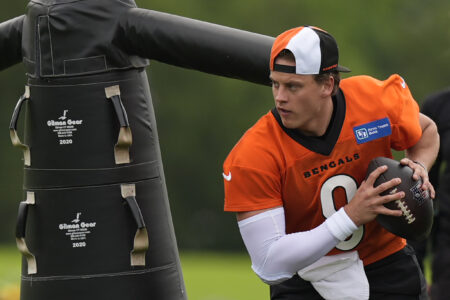 Cincinnati Bengals quarterback Joe Burrow runs drills with the ball during the NFL football team's practice on Tuesday, May 7, 2024, in Cincinnati. (AP Photo/Carolyn Kaster)