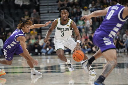 Baylor guard Jeremy Roach (3) dribbles against Tarleton State guards Jordan Mizell (4) and Izzy Miles (0) during the first half of an NCAA college basketball game, Sunday, Nov. 17, 2024, in Waco, Texas. (AP Photo/LM Otero)