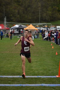 Wheeling Central’s Michael Hutnick crosses the finish line during Saturday’s Buckeye 8 and OVCCL Championship races at Buckeye Local High School in Connorville. He placed eighth in the OVCCL portion of the event.