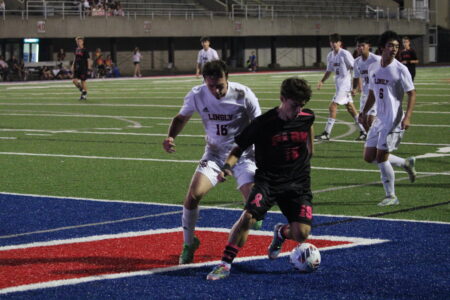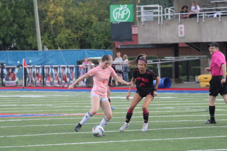 TOP: Linsly’s Evangeline Yendell (left) is pursued by Wheeling Park’s Layla Pettit (right). BOTTOM: Linsly’s Julia Fischer (left) and Wheeling Park’s Aiden McCroskey (right) battle for the ball. Wheeling Park and Linsly played a girls soccer/boys soccer doubleheader on Thursday night inside Wheeling Island Stadium. The two teams were holding a Pink Out for Breast Cancer Awareness, with Wheeling Park winning both legs of the doubleheader, 7-2 in the girls game and 1-0 in the boys game.