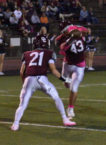 Wheeling Central’s Troy Mortakis (43) nearly intercepts a Barnesville pass earlier this season. Looking on is teammate Joey Hall (21). The Maroon Knights welcome Brashear to Bishop Schmitt Field Friday night for Homecoming.