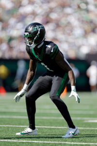 New York Jets cornerback Sauce Gardner (1) defends during an NFL football game against the Dallas Cowboys, Sunday, Oct. 5, 2025, in East Rutherford, N.J. (AP Photo/Adam Hunger)