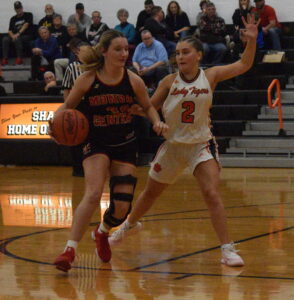 Monroe Central’s Miley Bommer (30) dribbles against the defense of Shadyside’s Cam Kolvek (2) during action from Monday night’s game inside the Tigers’ Den at Shadyside High School. The Seminoles posted a 69-33 victory.