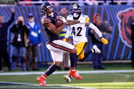 DJ Moore had five receptions for 64 yards and two touchdowns after catching just one pass over the previous two games. He caught a 5-yard TD in the first quarter, and his 25-yard score early in the third gave Chicago a 24-21 lead.