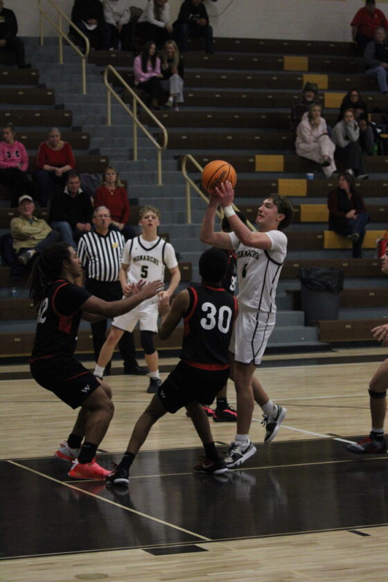 John Marshall’s Landen Snyder jumps up for a floater Friday against Weir inside the John Marshall Field House. Snyder scored 25 points in a Monarch victory.