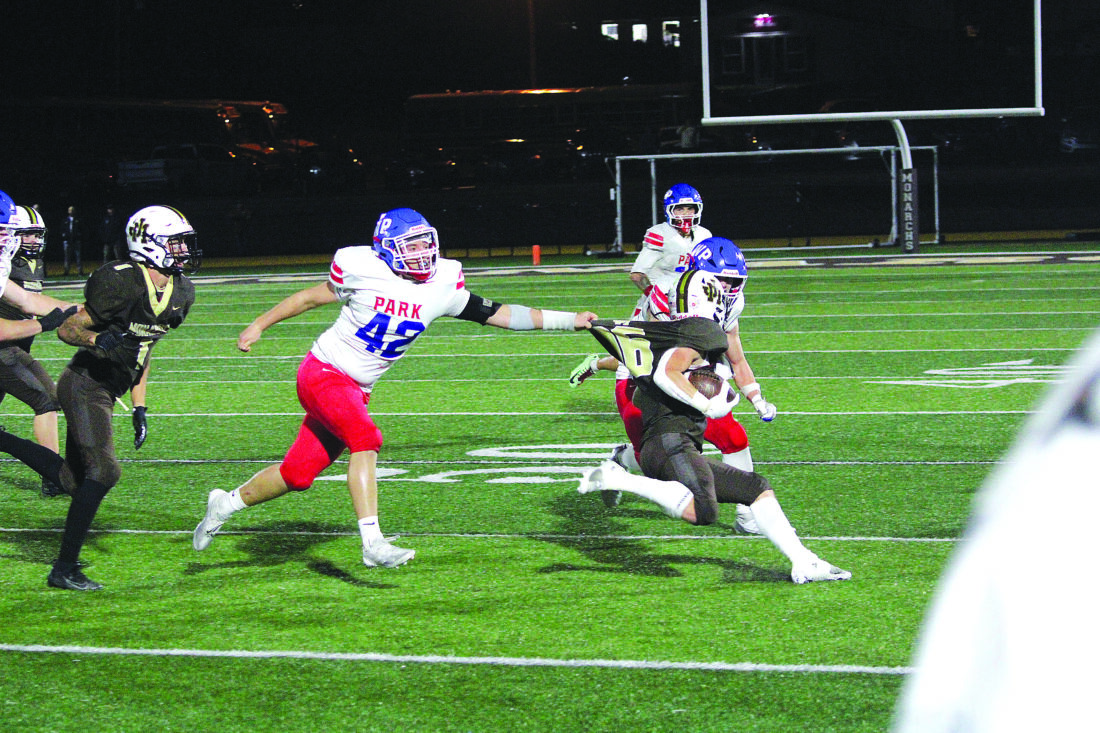 - John Marshall’s Cain Martin (16) tries to evade a tackle during the Monarchs’ regular-season game against Wheeling Park.