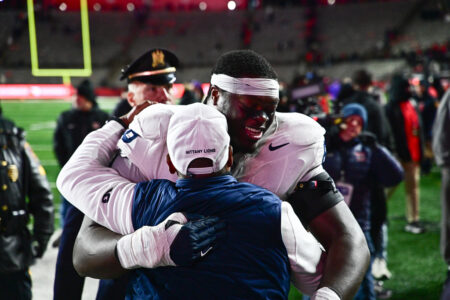Penn State interim head coach Terry Smith embraces offensive lineman Anthony Donkoh following an NCAA college football game against Rutgers, Saturday, Nov. 29, 2025, in Piscataway, N.J. (AP Photo/Caleb Cr
