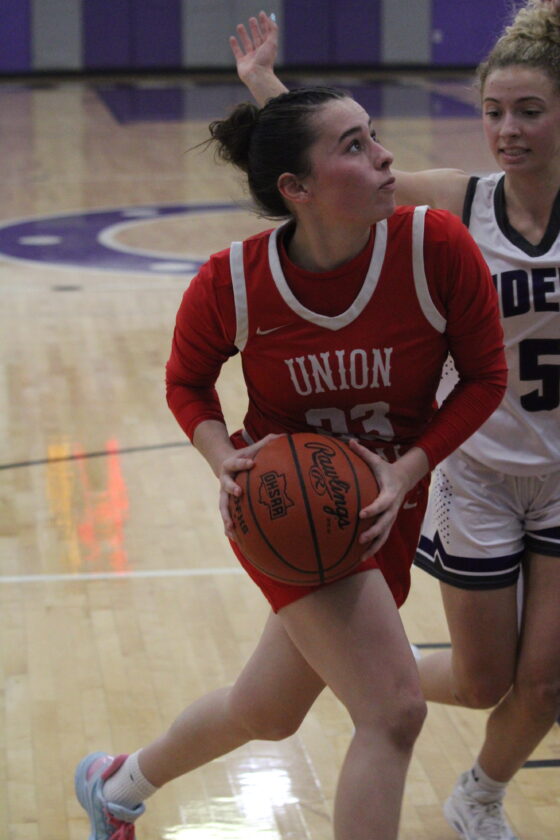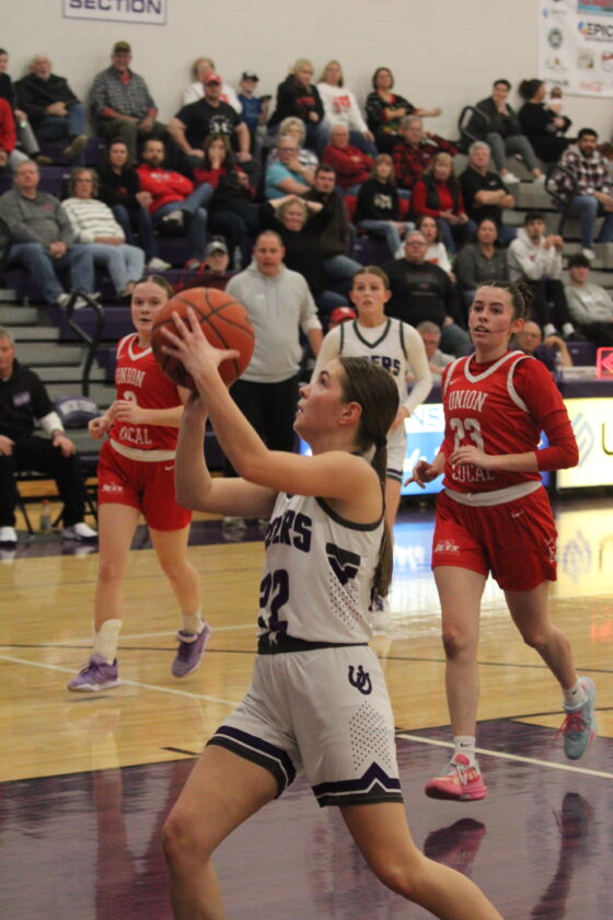 - Union Local’s Laken Vinskovich takes the ball to the basket Monday during the two teams’ game inside Tolbert Gymnasium.